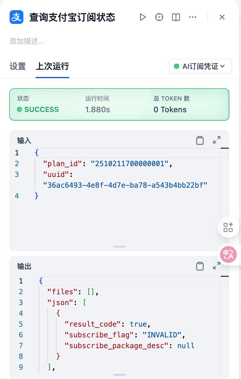 AI agent developers can seamlessly integrate subscription payment services through the Alipay AI Subscription Payment Plugin. This plugin enables developers to implement flexible pricing models (per-usage or time-based) within their AI agents. Currently, it provides subscription initialization, subscription status querying, and subscription-based consumption tracking capabilities.