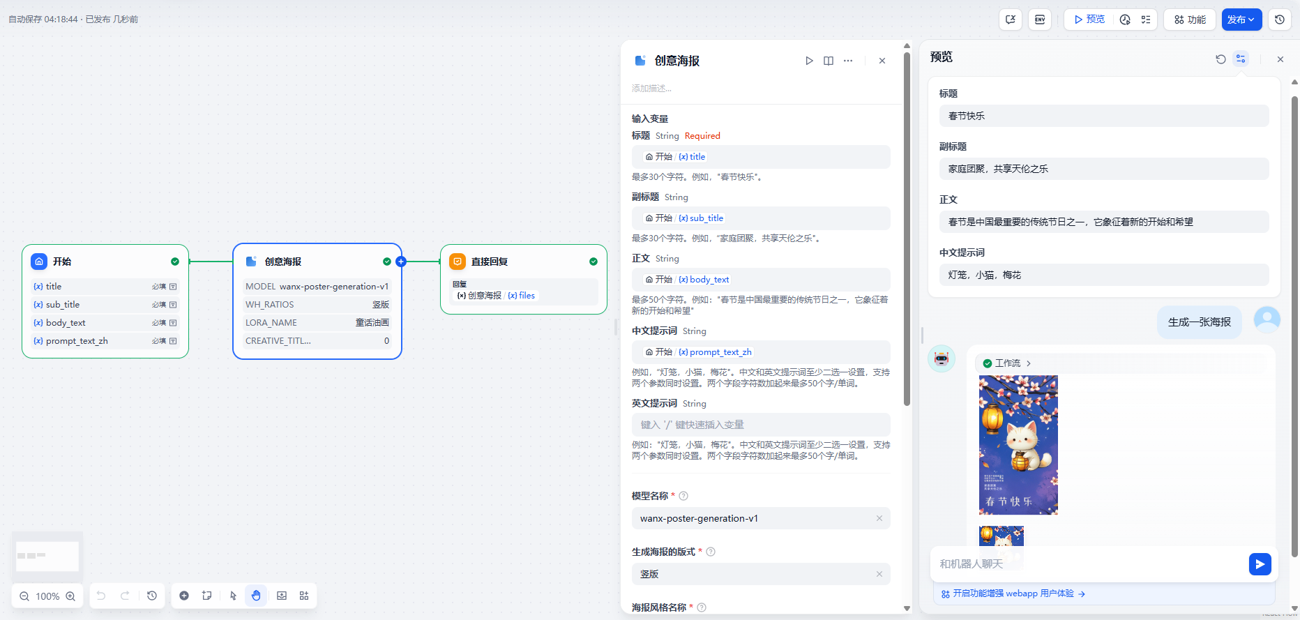 Generate creative posters from titles, subtitles, body text, and prompts. This feature is ideal for designing brand promotional posters, event flyers, and social media covers using pre-defined or custom poster templates.