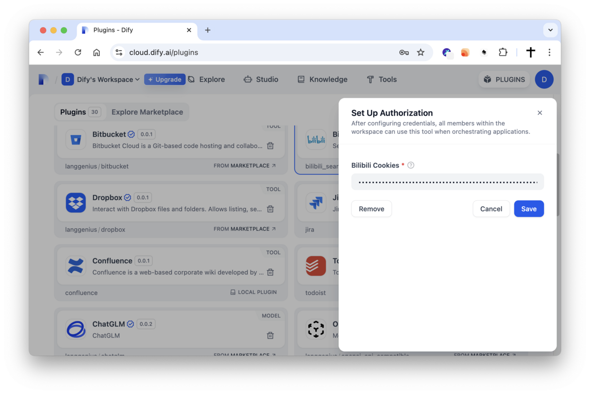 - When adding or configuring the Bilibili Search plugin in Dify, you will be prompted to enter your Bilibili cookies in the credentials section.