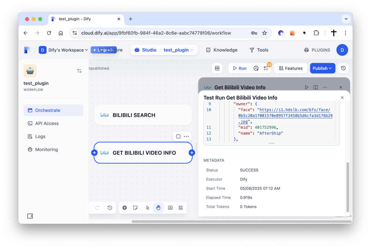 - Enjoy the plugin! You can now use the Bilibili Search tools within your Dify applications.