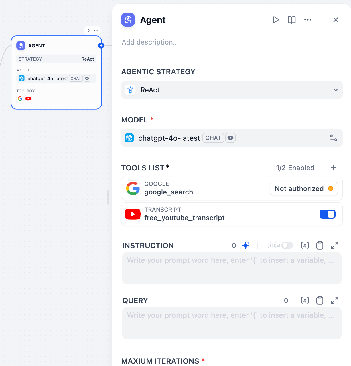 The Agent node in Dify Chatflow/Workflow lets LLMs autonomously use tools. This plugin features two official Dify Agent reasoning strategies, enabling LLMs to dynamically select and run tools during runtime for multi-step problem-solving.