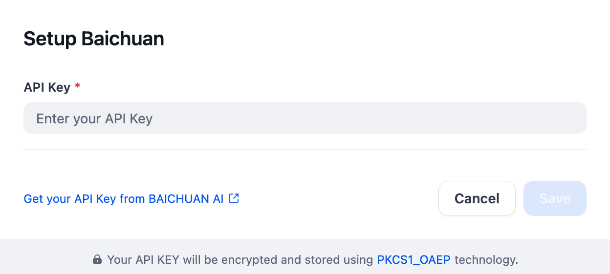 After installing the plugin, configure the API key and API base within the Model Provider settings. Obtain your API key from here. Once saved, you can begin using Baichuan to build your AI agents and agentic workflows.