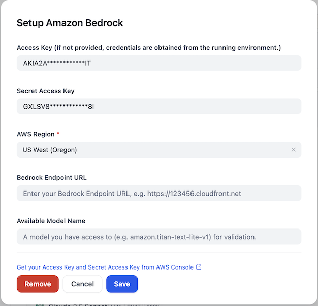 安装插件后,在模型提供商设置中配置 Amazon Bedrock 凭证。您需要提供 AWS Access Key、Secret Access Key 并选择适当的 AWS 区域。如果需要,您还可以指定 Bedrock 端点 URL。为了进行验证,您可以提供一个您有权访问的可用模型名称(例如:amazon.titan-text-lite-v1)。
