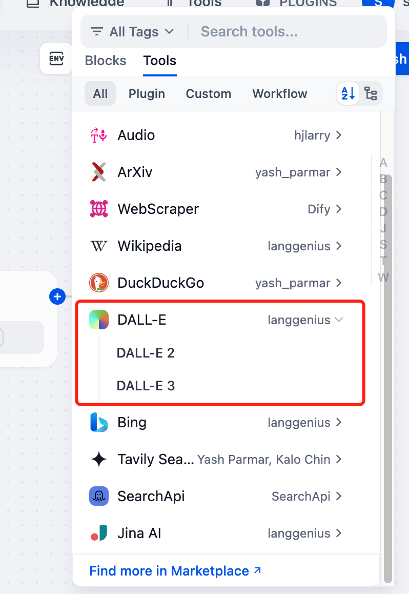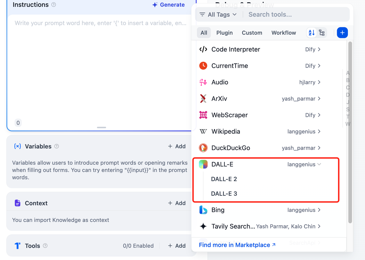 The Dall-E tools could be found at the Plugin Marketplace, please install it first.