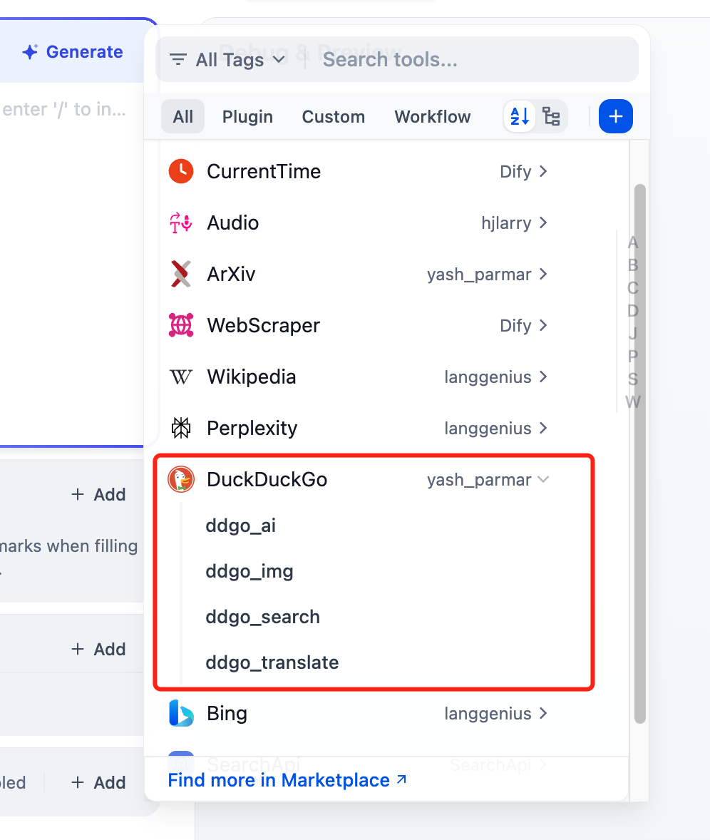 Both Chatflow and Workflow applications support adding DuckDuckGo tool nodes, it provides four tools: ai chatbox, image search, simple search, and translation.