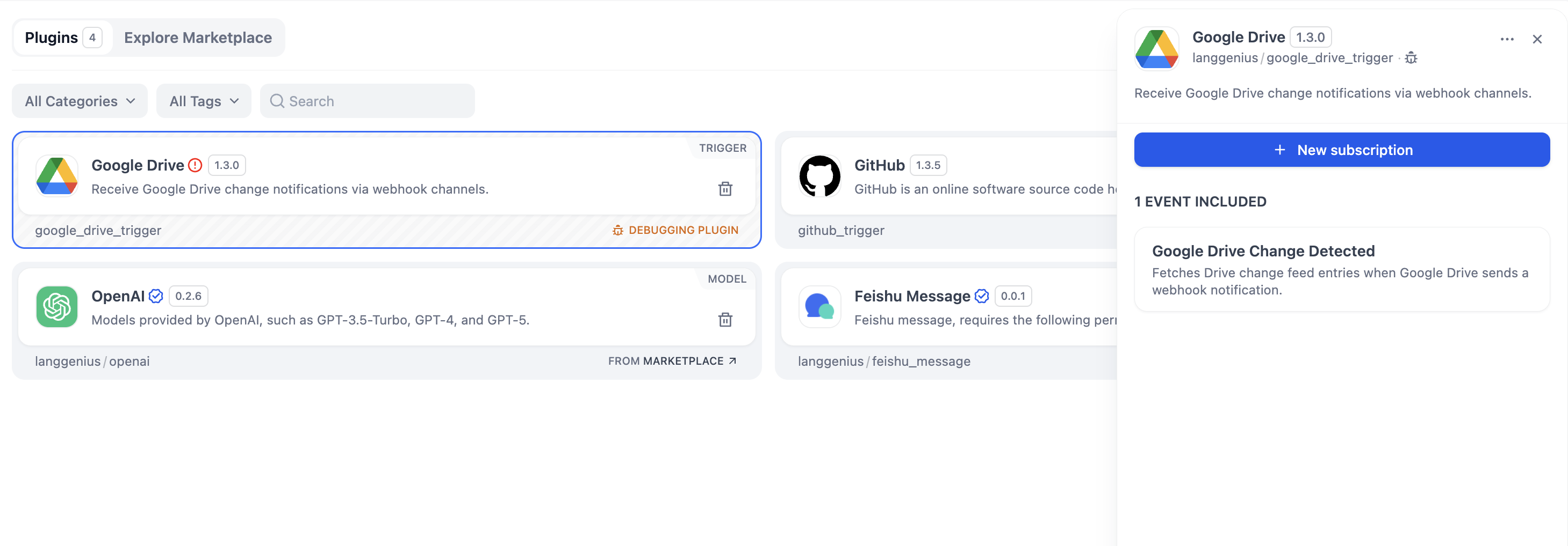 - Open the Google Drive Trigger Plugin in Dify and click New Subscription → Create with OAuth.