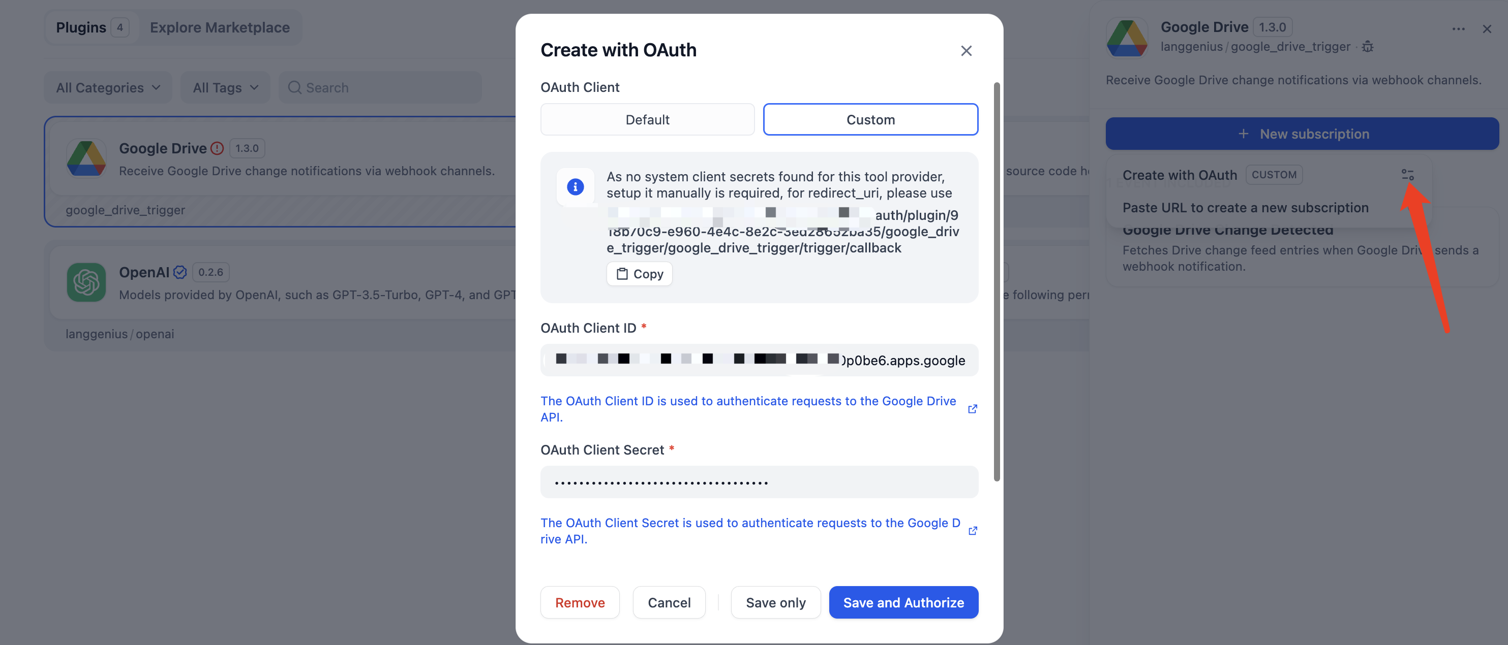 - When Dify asks for an authorized redirect URI, paste the callback URL shown in the subscription dialog, then copy the generated Client ID and Client Secret back into Dify.