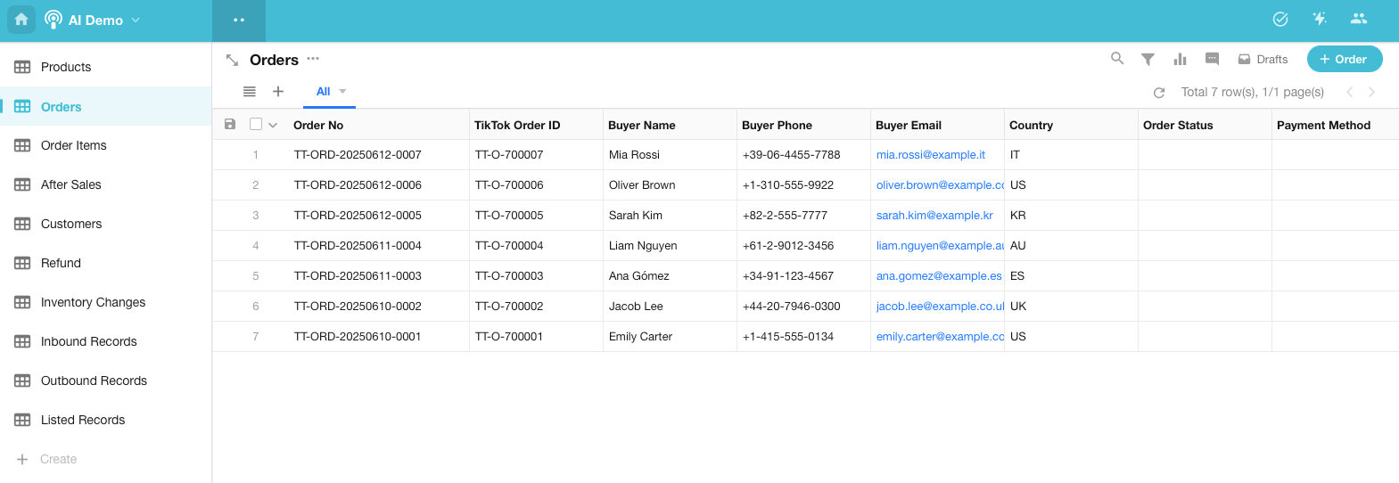 你可以用下面的对话来让 AI 帮你创建一个 TikTok 的订单管理系统: