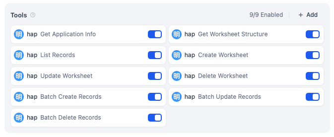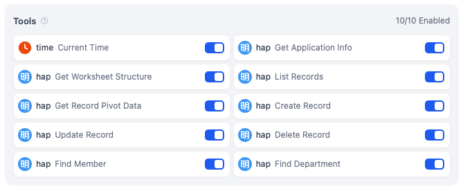 配置下面的工具,我们可以创建一个管理应用数据的Agent,可以对应用内的数据进行查询、统计以及增删改。