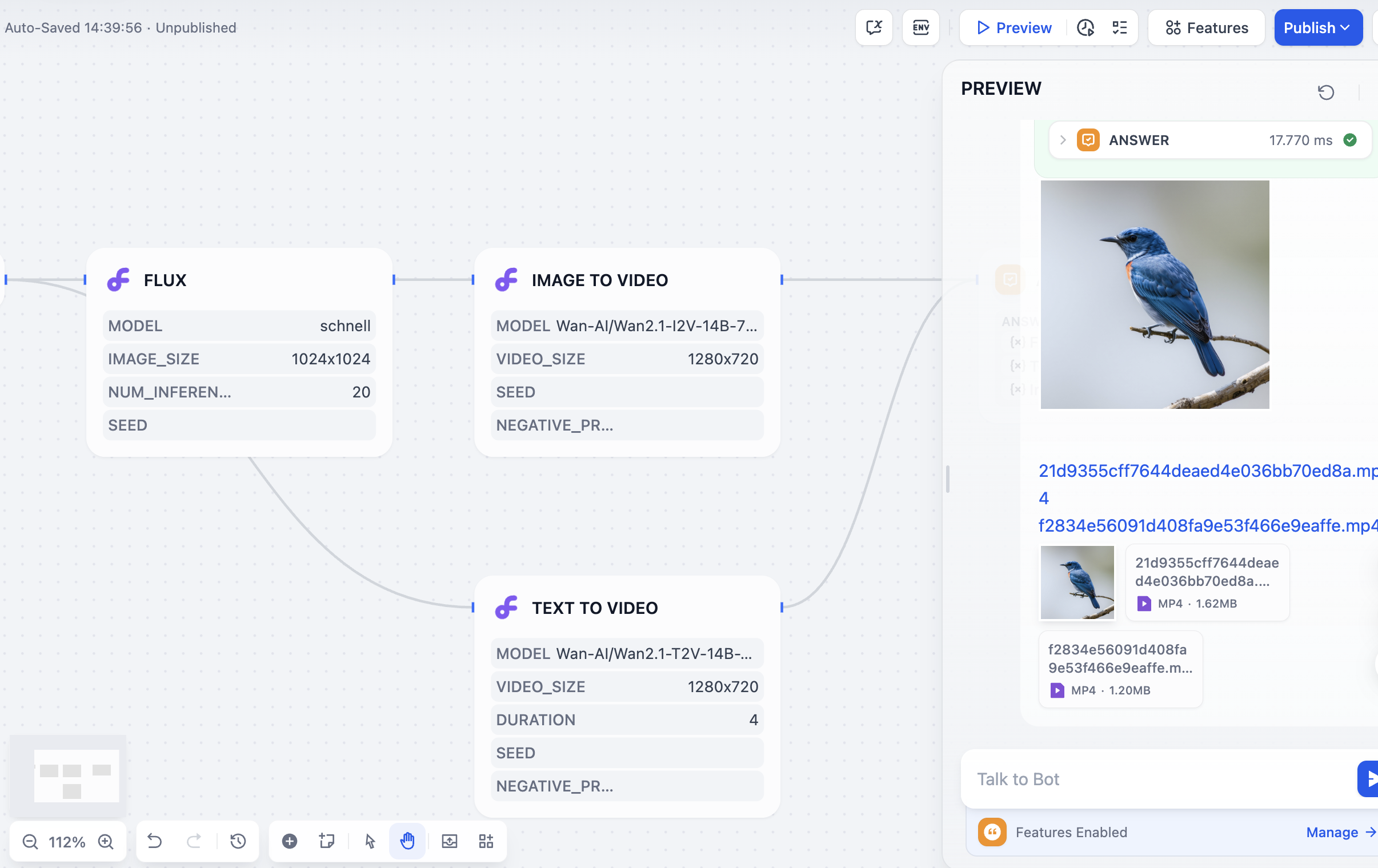 Add the SiliconFlow tool in the Agent application, then send an image-generation, image-editing, or video-generation prompt in the dialog box to call the corresponding unified tool.