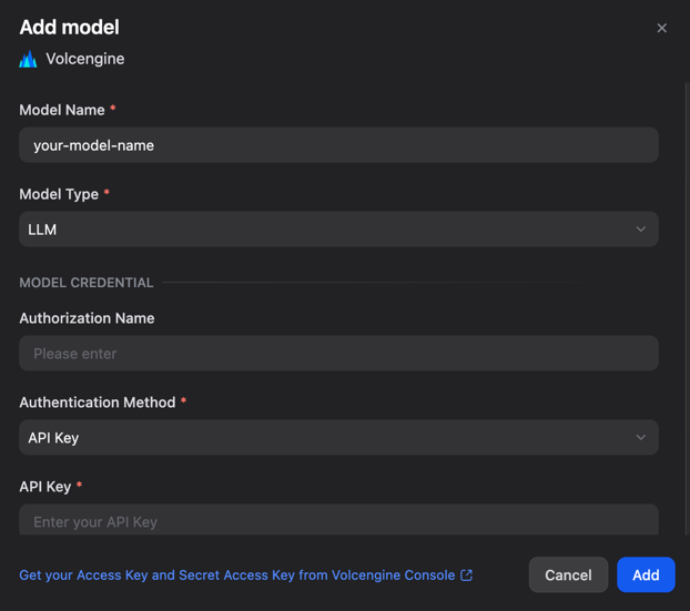 - In Dify, go to Settings -> Model Provider -> Volcengine Ark (Endpoint).