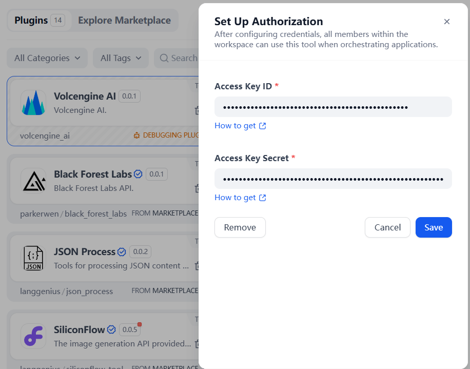 On the Dify navigation page, click Tools > Volcengine AI > Authorize to fill in the Access Key ID and the Access Key Secret.