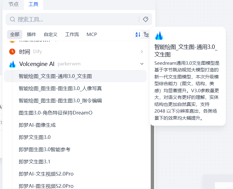 Both Chatflow and Workflow applications support adding Volcengine AI tool nodes.