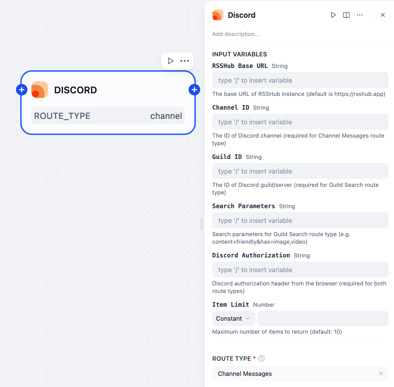 - : Discord channel ID, required for Channel Messages route type
