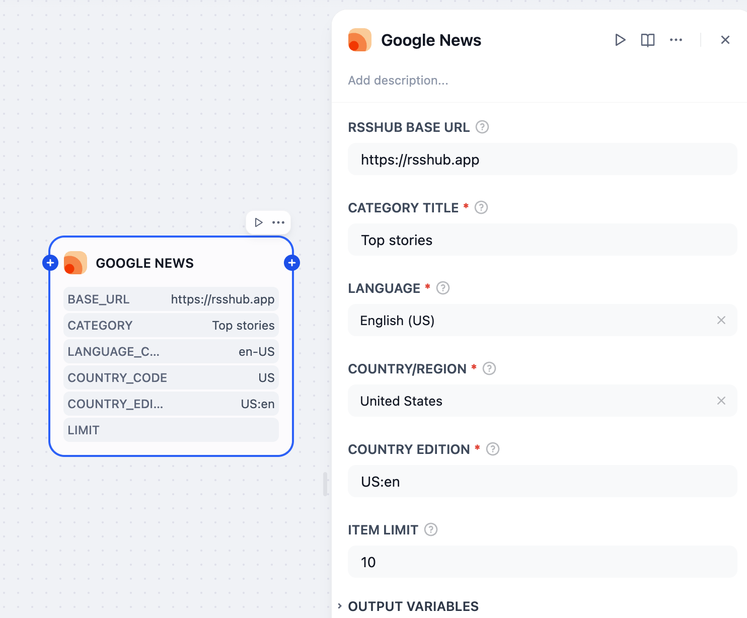- : Country edition for Google News, usually in format 'COUNTRY:LANGUAGE', e.g. 'US:en', 'CN:zh'