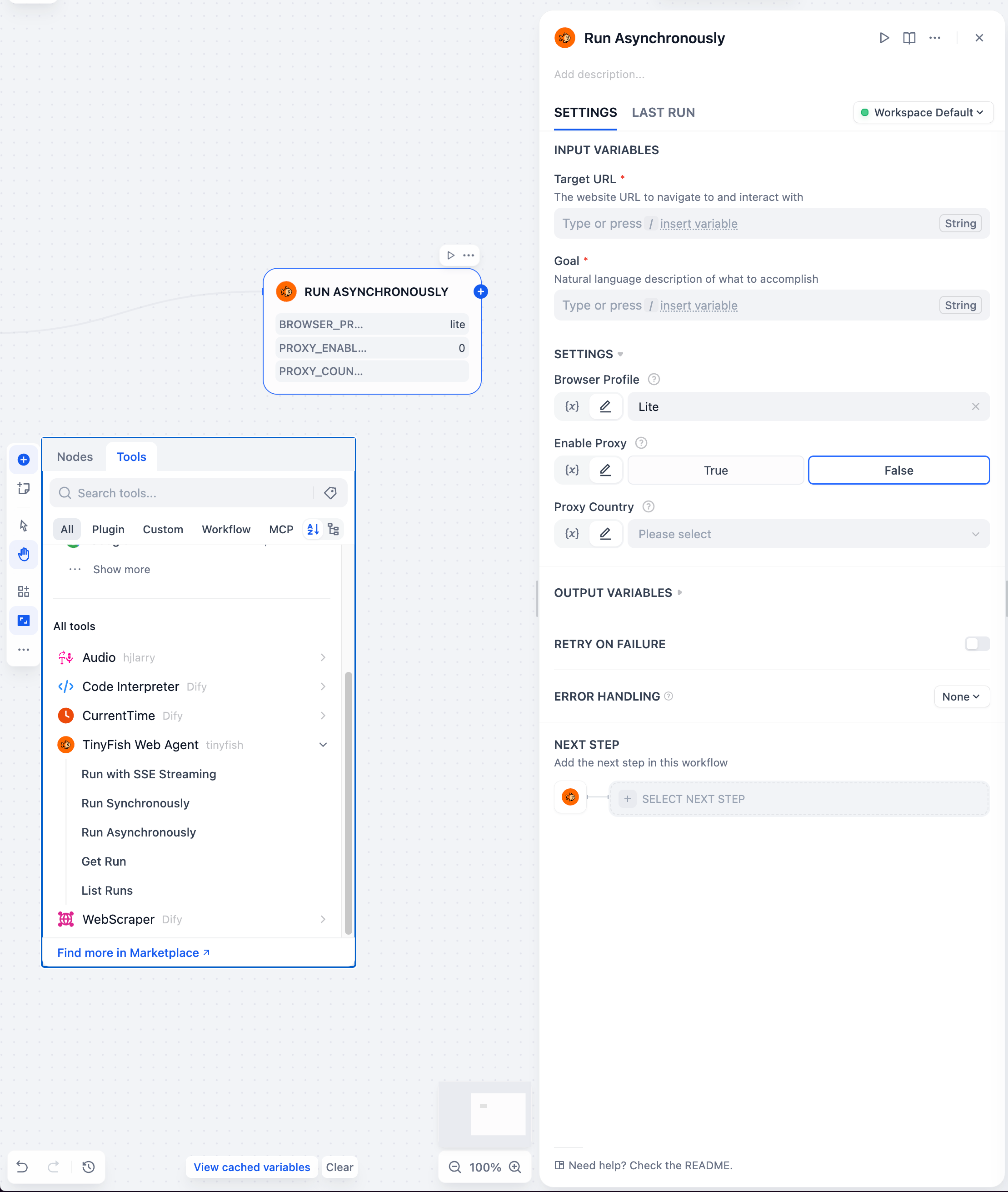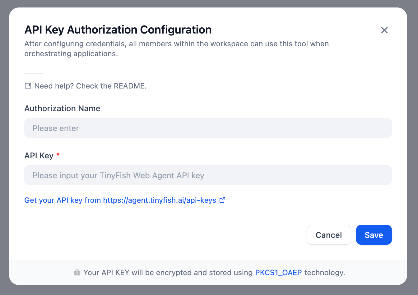 Go to Plugins > TinyFish Web Agent > To Authorize in Dify and input your API key.