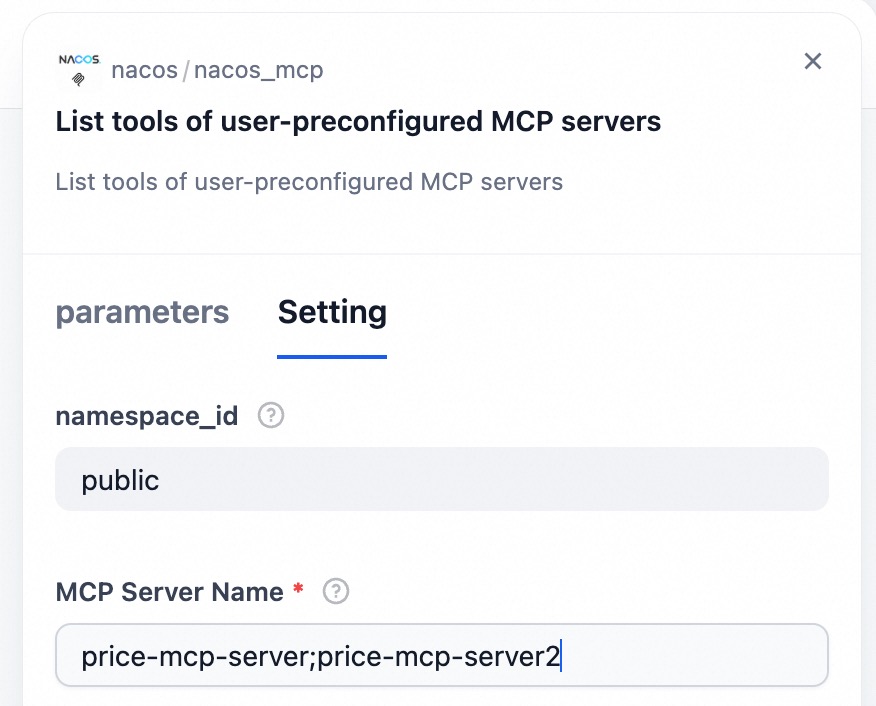 In List Tools of User-Preconfigured MCP Servers, you need to enter the names of the MCP Servers in Nacos. Multiple MCP Servers are supported, separated by .